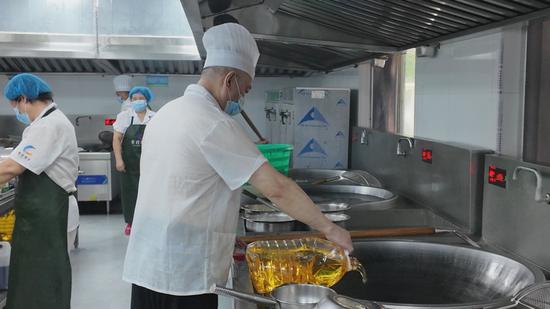 下午三点半,记者佩戴工作帽和口罩后走进学校食堂后厨。正值晚餐加工环节,工作人员身着统一工作服,正有条不紊地进行餐品制作。后厨地面干净整洁,食材分类存放有序,各空间分隔进一步完善,实现了人员的有序流动和菜品的运输安全。