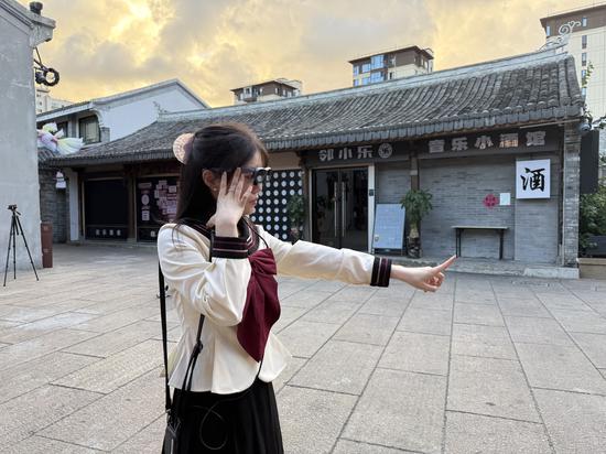 9月25日,记者提前探访寺前街,亲身体验了这一项目。在引导角色“乾一”——一只憨态可掬的小龙陪伴下,记者完整经历了从“庆生”“入泮”到“冠婚”“寿庆”的八禧旅程。场景互动感极强:在太师牌坊前,明代首辅张璁“现身”出题,游客可凌空点选答案;古戏台边,礼成的新人抛出喜糖,伸手仿佛就能接住祝福;老员外寿宴上,可虚拟献礼贺寿;甚至当倭寇与洪妖来袭,只需张手就能释放能量击退敌人……50分钟的冒险轻松愉快,吸引不少路人驻足询问,展现出项目强大的吸引力。