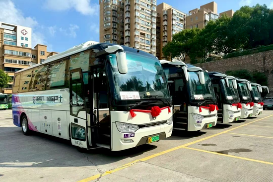 在城关车站,五辆车身印着醒目“浙客行·城际巴士”标志的新能源客车整齐排列。不少提着行李的市民有序排队,他们将成为这条新班线的首批体验者。