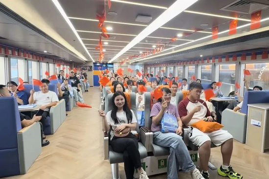 “百岛明珠号”的甲板上,一面面小国旗飘成“红色海洋”,游客们举着工作人员赠送的国旗对着海景拍照打卡。等到《歌唱祖国》《我和我的祖国》等歌曲响起,大家自发跟着驻唱歌手大声合唱,合唱声伴着海浪声,成为海上最动人的旋律。