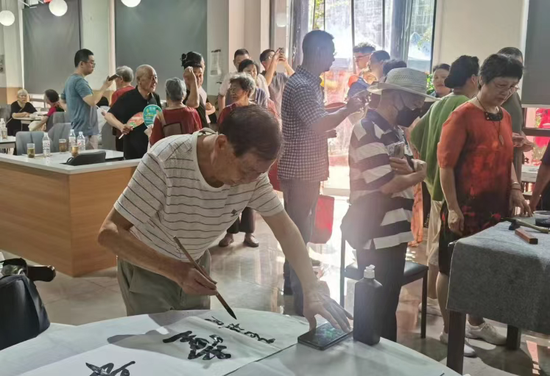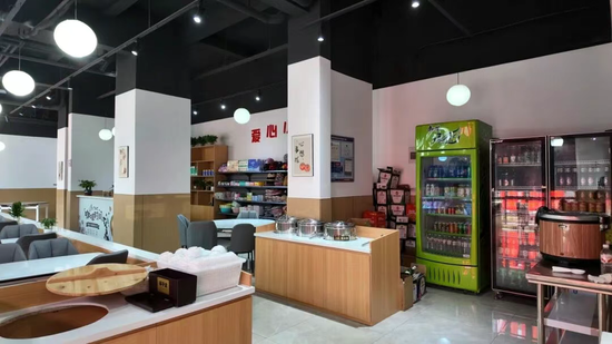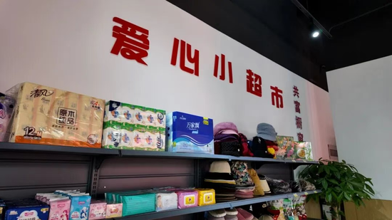 刚进门,记者就被热闹劲儿包围,明亮的就餐区里,老人们端着热乎饭菜边吃边聊;角落的休闲区飘着茶香,几位社区老年人正围在一起写书法;一旁的爱心小超市里,纸巾湿巾、牙膏牙刷等生活用品摆得满满当当,共富橱窗前还围了不少人在挑选产品。
