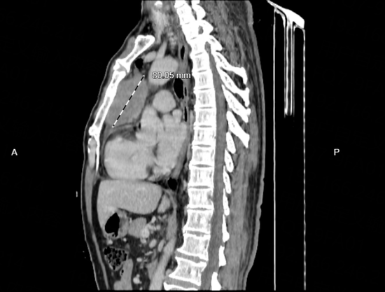 影像检查结果令人揪心:一个尺寸约7*8cm的巨大肿块,盘踞在紧邻心脏的前上纵隔区域。这颗肿瘤位置极其险要,不仅严重压迫周围组织,更已侵犯心包,如同一颗“不定时炸弹”,随时可能影响心脏功能,危及生命。