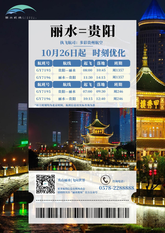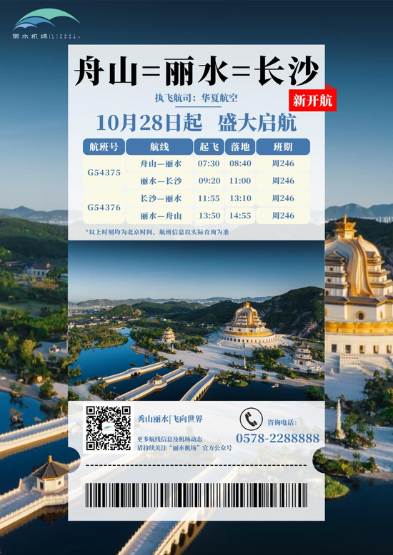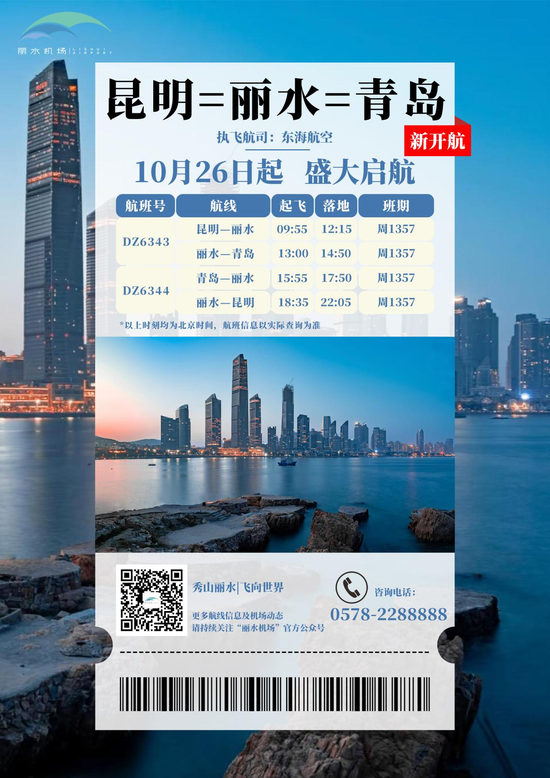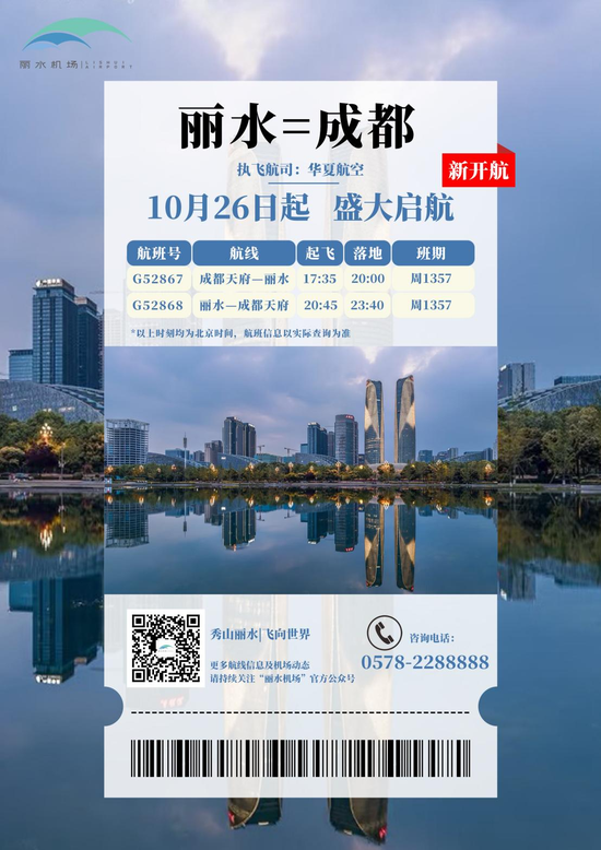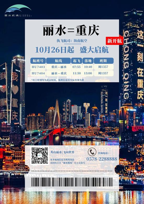10月26日起重磅新增:新增重庆、成都、西安、昆明、青岛、长沙、舟山7个通航点。这意味着,从全国十多个主要城市,你都可以一张机票,直飞丽水,为计划前来参加丽水摄影节的广大摄影爱好者和旅客提供更多出行选择,真正实现“去丽水,说走就走”。
