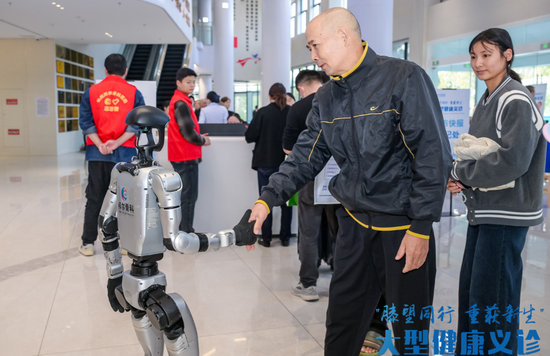 不同于传统义诊的严肃氛围,本次活动创新融入了多元趣味元素,让健康科普变得生动鲜活。宇树机器人的亮相成为现场 “人气担当”,灵活的动作、亲切的互动让市民们眼前一亮,大家纷纷上前握手、打招呼,小朋友们更是围着机器人欢呼雀跃,在欢声笑语中拉近了与医疗科技的距离。