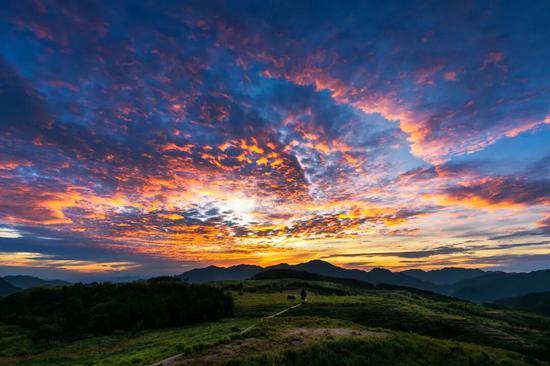 郑佩勇 摄作为莲都区的最高峰(海拔1083米),大山峰因山顶平坦如“山峰”而得名。山顶草甸绵延约200亩,山顶矗立着10余座风力发电机,风车叶片在风中转动,与蓝天白云、草甸构成清新的田园风电景观。