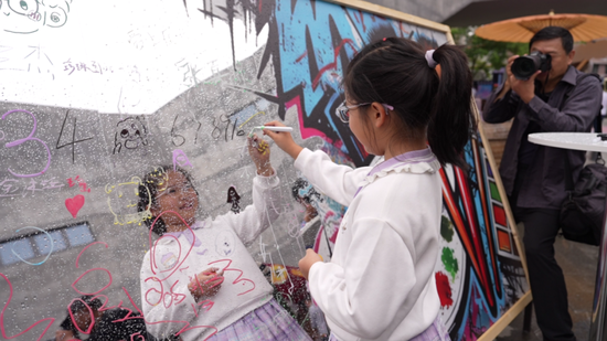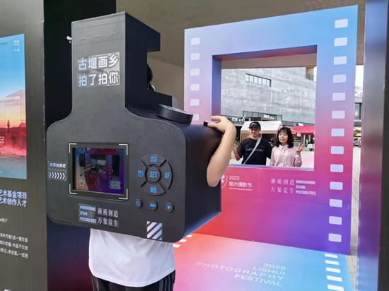 摄影节期间,位于古堰画乡的“潮流青年”潮玩市集率先点燃热度。作为市集“吸睛担当”的相机人NPC互动区,一开放便排起长队,造型呆萌又具科技感的相机人穿梭在市集各处,主动与游客招手、摆pose,游客只需扫码即可触发现场拍照功能,短短几分钟就能拿到印着古堰画乡美景与个人笑脸的实体照片。