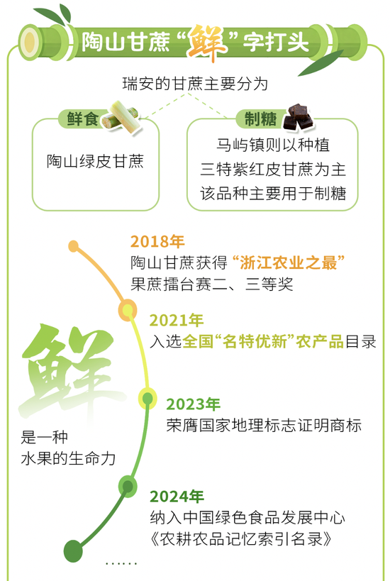 “鲜”是一种水果的生命力,在这点上,陶山甘蔗有着绝对优势。2018年,陶山甘蔗获得“浙江农业之最”果蔗擂台赛二、三等奖;2021年入选全国名特优新农产品目录;2023年荣膺国家地理标志证明商标;2024年纳入中国绿色食品发展中心《农耕农品记忆索引名录》……