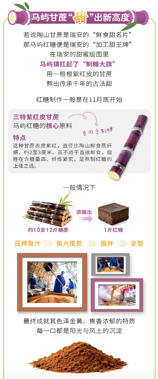 若说陶山甘蔗是瑞安的“鲜食甜名片”,那马屿红糖便是瑞安的“加工甜王牌”,在瑞安的甜蜜版图里,马屿镇扛起了“制糖大旗”,用一根根紫红皮的甘蔗,熬出传承千年的古法甜。