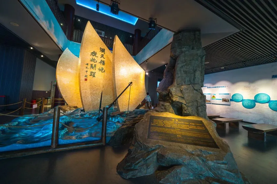 一楼“帆锚相依厅”,贝雕《帆锚相依》象征先民开发洞头;二楼“耕海牧鱼厅”展示渔业概况与习俗;三楼“闽瓯风情厅”介绍渔村生活习俗;四楼“非遗奇葩厅”展非遗项目;五楼“观光休闲厅”可俯瞰洞头全貌。