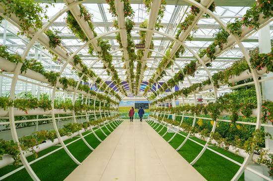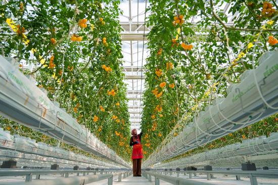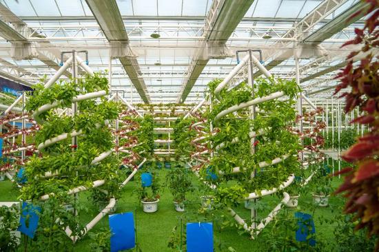设施农业的崛起,也为柯城农业插上了科技翅膀。走进位于万田乡的四省边际数字农业科创园一号馆,科技感扑面而来——三米高的“红薯树”舒展枝丫,两个拳头大的红番茄挂在藤蔓上,蔬菜苗在“摩天轮”架上错落生长,生菜在“太空舱”般的培育箱里绿意盎然。