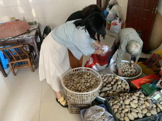 周金明早早在屋里等着,桌子上还摆着十几个刚摘下的葫芦。“以前摘了菜都是等亲戚来拿。现在好了,不仅有人给我送饭,还顺便把菜收走,还有钱拿!”这天,他卖出了37斤葫芦,每斤2元,收入74元。