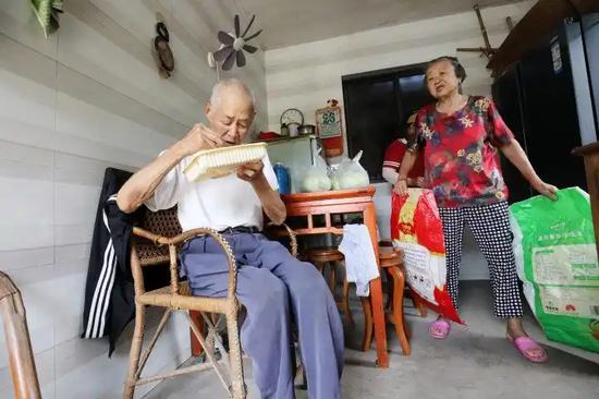 上午11点不到,百丈镇人大代表、镇养老食堂工作人员蒋月云来到仙岩村92岁周金明家门口,从保温箱里拿出一份盒饭,送进屋。