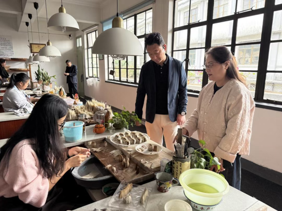 会议结束不久,沈虹、张曦明便同文旅专业代表小组的代表联合在善琏镇考察湖笔产业,深入走访湖笔工厂,了解湖笔制作工艺。同时,针对化妆笔制作要求,分析传统湖笔制作与化妆笔生产在选料、水盆、结头等工序上的异同,梳通120余道工序嫁接点,为跨界合作提供技术支持。