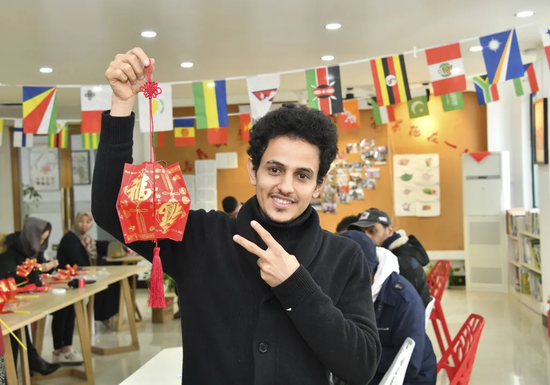 在义外籍人员展示自己制作的灯笼 王洁/摄