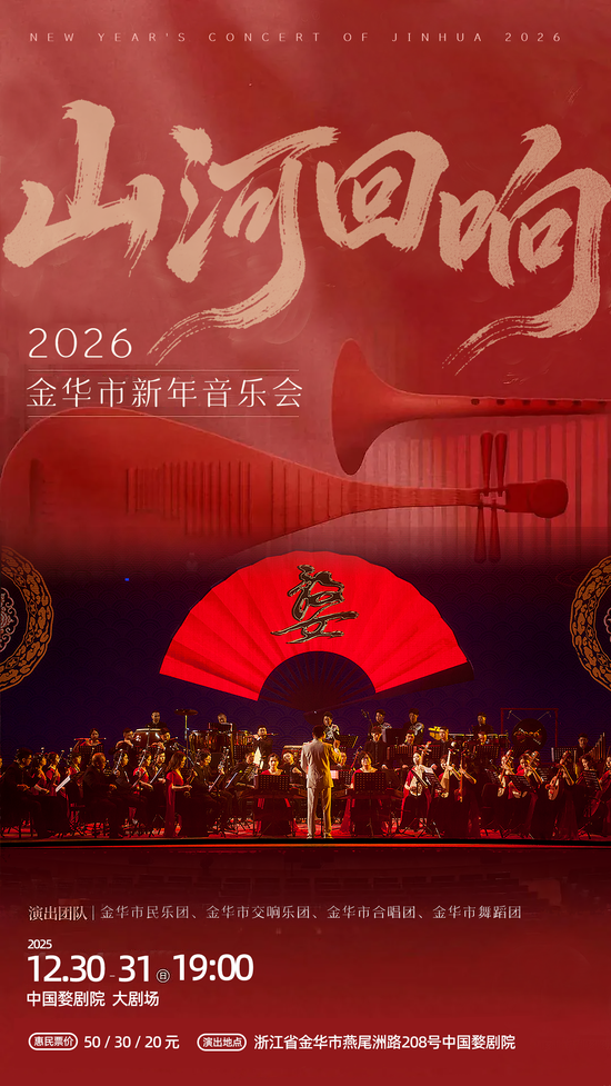 2025年12月30日和31日19:00 ,中国婺剧院华灯璀璨,倾情演绎2026金华市新年音乐会暨“山河回响”金华市四支队伍汇报演出。本场演出由金华市民乐团、金华市交响乐团、金华市合唱团、金华市舞蹈团联合献演,集民乐婉转、管弦交响、合唱磅礴、舞蹈热烈于一体,以多元艺术形态交织呈现视听盛宴,带您沉浸式感受灵魂与旋律的深度共鸣!