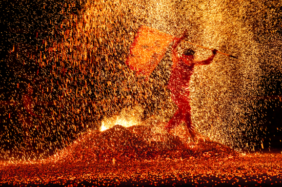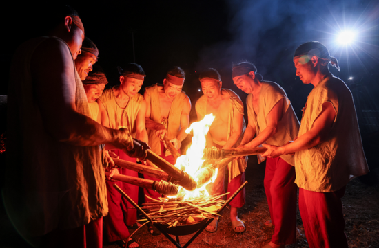 赤脚的汉子在通红的炭火上奔跑 呐喊