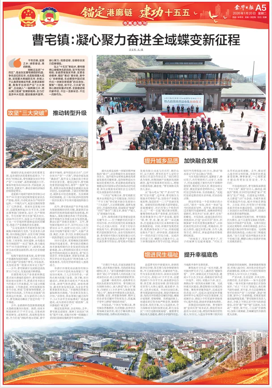 刚刚过去的“十四五”,是金东区曹宅镇抢抓机遇、争先进位的五年,也是取得重大成就、实现重大跨越的五年,全镇上下认真贯彻落实市委、区委决策部署,聚焦平台项目产业“三大突破”,主动融入“一轴两廊三片、倚山拥江揽湖”发展新格局,全力打造浙中大花园、建设最美共富带,凝心聚力、锐意进取,全镇综合实力显著增强。