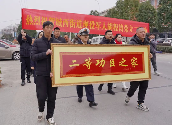 胡程涛,1996年出生,系城西街道下岙村人,现服役于中国人民解放军陆军第73集团军某合成旅,其爷爷奶奶居住在许宅村。“特意把喜报送来这里,我想和长辈们第一时间分享这份喜悦。”这份孝心让现场更添温情,胡程涛的爷爷奶奶望着红彤彤的牌匾与喜报,满脸欣慰。