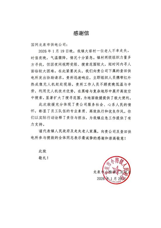 1月26日,国网龙泉市供电公司收到来自龙泉市小梅镇人民政府的一封感谢信,查田供电所无人机飞手郑孝斌参与失联聋哑人救援的事迹也在该公司传扬了开来。