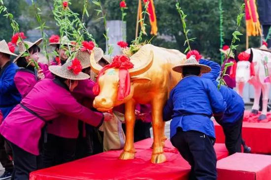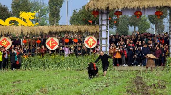 在湖南郴州,“安仁赶分社”活动同样热闹,当地群众以传统的劳动仪式纪念神农,在龙腾狮舞、鞭炮齐鸣中开启春耕第一犁,唤醒沉寂一个冬天的肥沃土地。丽水遂昌“班春劝农”活动也设有“鞭春”环节,挥鞭击打“春牛”后,春牛肚里溢出五谷,众人欢呼,争抢五谷,兆示“五谷丰登”。