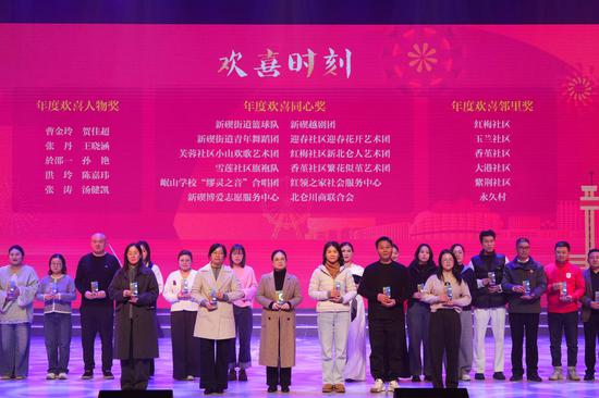 魔术《欢喜共此时》,魔术师林广带着全场观众将手中四张卡片变出“新欢喜” “马年吉祥图”等祝福,赢得阵阵掌声,接下来的人屏互动魔术更是展示了“年度欢喜同心奖”“年度欢喜邻里奖”“年度欢喜人物奖”新欢喜年度表彰仪式环节,曹金玲、贺佳超、张丹等个人、团体和社区收获荣誉。手捧年度欢喜邻里奖的香堇社区党委书记李静琦感慨道:“这一年最感动的是看到居民的变化。一开始大家只是远远看着,后来主动举手报名,再到拉着家人朋友一起参与。文化把大家的心聚拢了,邻里门打开了,关系暖了。”