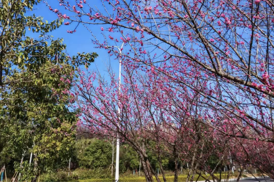 微风拂过,花瓣轻颤,河面红影浮动、波光粼粼。缕缕暗香漫过绿道,跨过河畔,裹挟着草木的清新,让在公园内休闲锻炼的市民不自觉放慢脚步,沉醉在这份独有的冬日芬芳里。