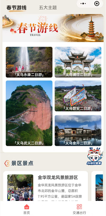 更智能的是,页面侧的 “AI出行管家” 就像一位随身旅行顾问。例如,输入“正月初二从婺城区到义乌,一家三口一日游怎么安排?”它便能结合人数、时间、兴趣等生成一份包含交通、景点、餐饮的个性化计划,让行程规划变得轻松又高效。