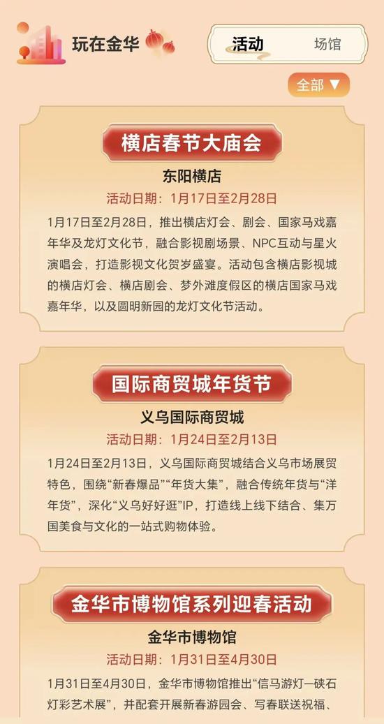 春节期间哪里年味最浓?“活动演出”版块汇总各地新春民俗、文化活动等信息,助力游客沉浸式体验金华年。