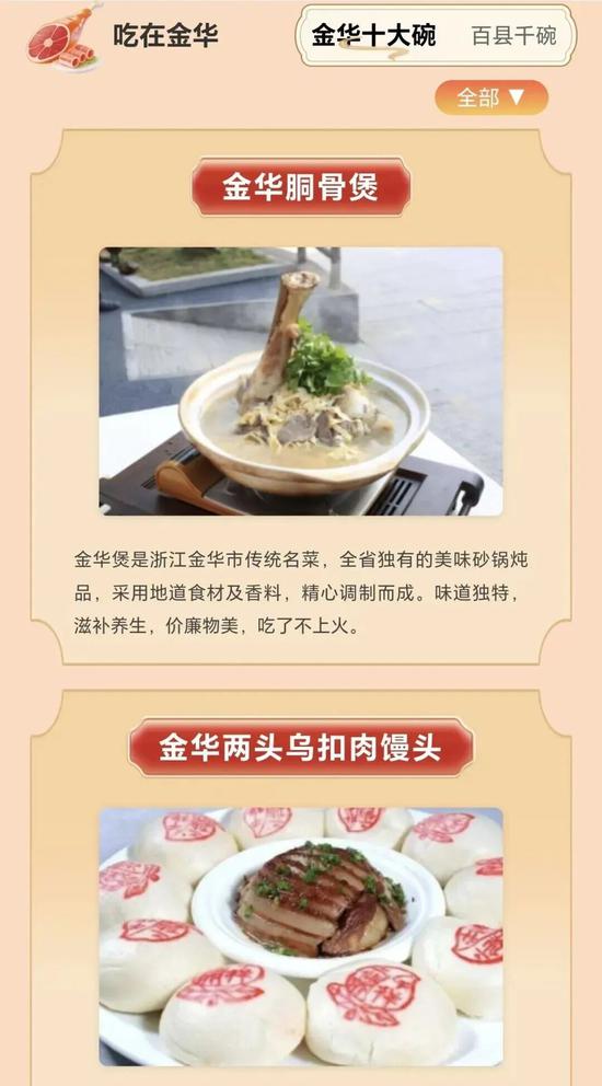 对于吃货来说,“特色美食”版块不容错过,里面图文并茂地介绍了“金华十大碗”与“百县千碗”,可以一眼锁定地道金华味。