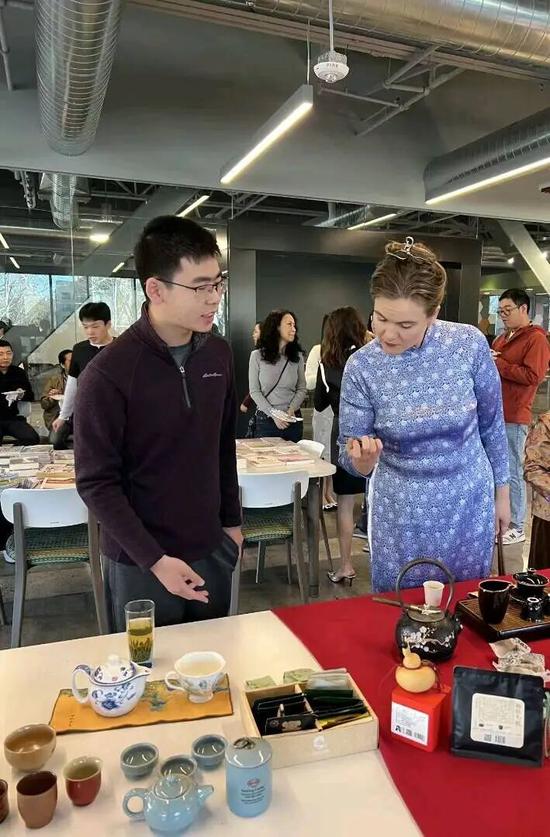 美国嘉宾围了一层又一层。有人问这是什么茶,有人问哪里能买,有人举着手机录下她泡茶的全过程。