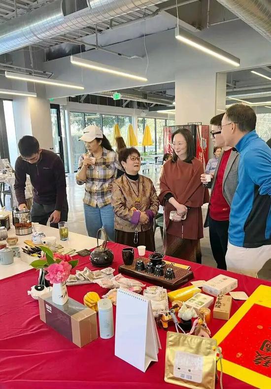 中国驻旧金山总领事张建敏以及中美企业代表们驻足茶席前。他们端起茶杯细品,听邓萍介绍武阳春雨的历史——唐代贡茶、明清御品、世博会金奖。有中企代表品尝后点赞:“这是真正的中国味道。”
