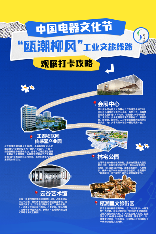 这条特色线路以柳市会展中心为起点,沿途串联正泰物联网传感器产业园、林宅公园、云谷艺术馆、瓯潮里文旅街区等柳市电气产业地标及文旅地标,形成“产业科技+园林休闲+非遗艺术+ 潮流文旅”的特色游览线路。