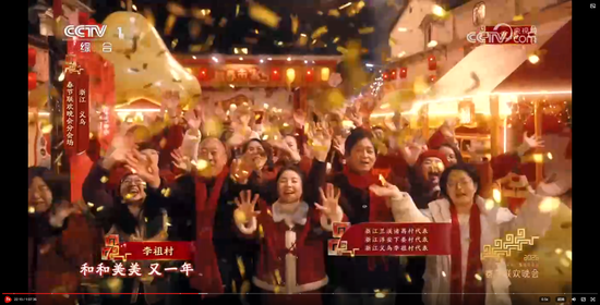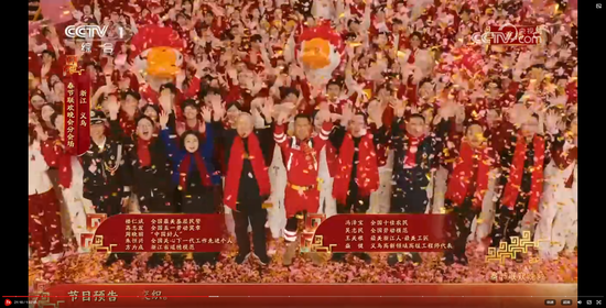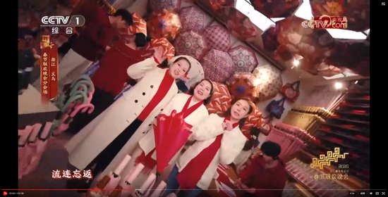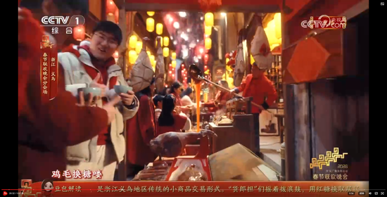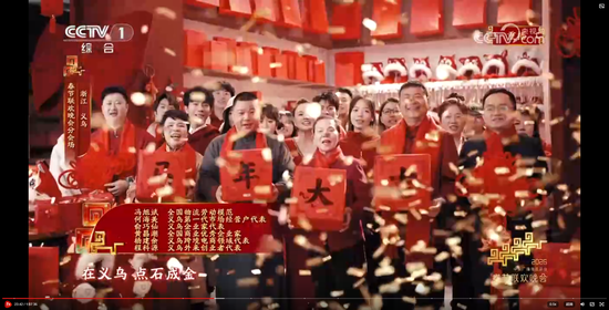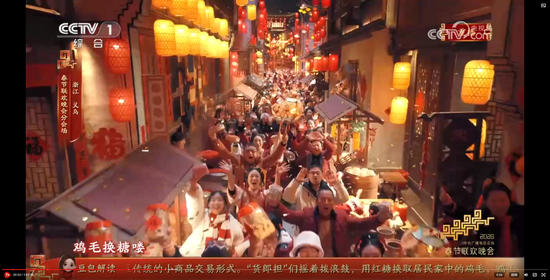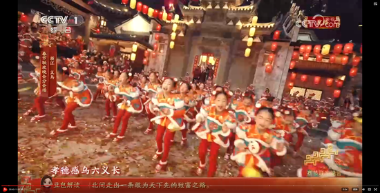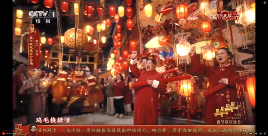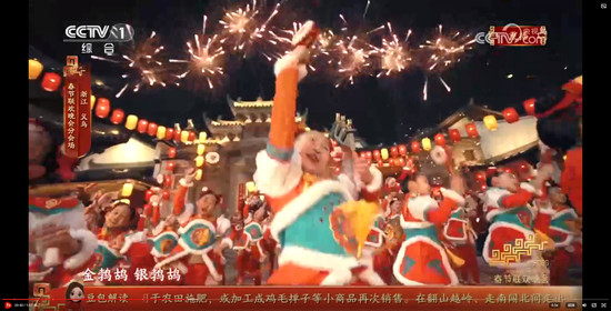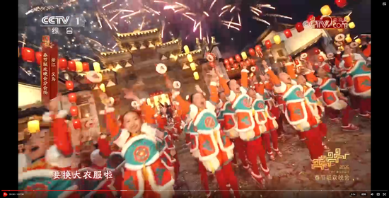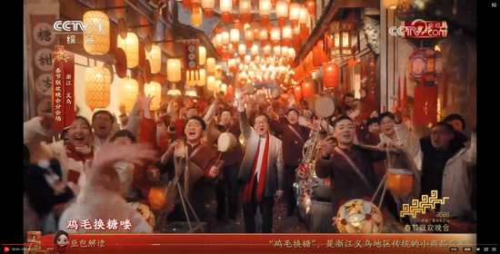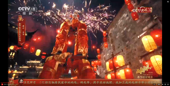 义乌8分钟节目《在世界义乌过中国年》,在闪耀的灯光、绽放的礼花和大家的欢呼祝福声中收尾。主舞台上空一片鸡毛缓缓升空。大家还记得那部反映义乌改革发展历程和义乌人创业故事的浙产剧《鸡毛飞上天》吗?剧中“鸡毛很贱,但是它养活了我们的祖祖辈辈,鸡毛也很轻,但只要有点儿风,它就能飞上天。”正是义乌“莫名其妙、无中生有、点石成金”的注解。