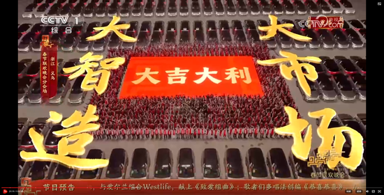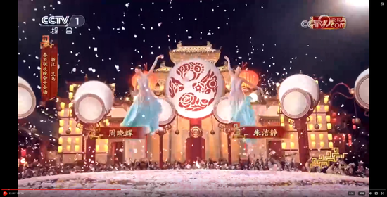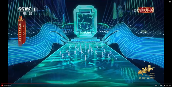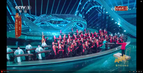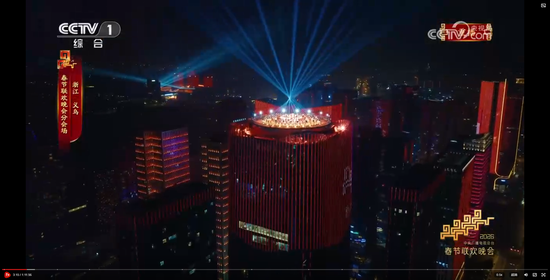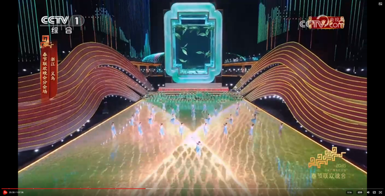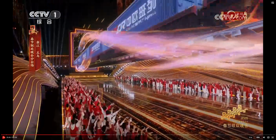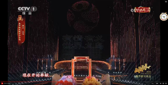 主舞台上空,由无人机变幻出“有情有义·世界义乌”的巨型城市文化品牌标识,与春晚义乌分会场“丝路欢歌”的主题相得益彰。