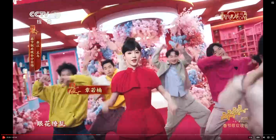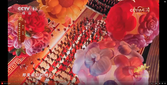 浙江温州的章若楠不仅在春晚上超美变装,身后的仿真花也是义乌市场的优势品类。