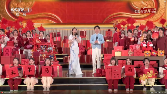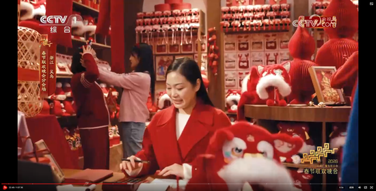 主持人在义乌分会场向观众问好。画面中是各类春节喜庆用品,身后还有众多礼物盲盒,“笑笑马”也在画面中亮相。你知道吗?国内市场超80%的年画与春联出自义乌。凡有华人华侨的地方,几乎都能寻到来自义乌的年画、挂历与对联。义乌每年向全球100多个国家和地区出口的2万多个品类圣诞用品占全球市场的近80%。