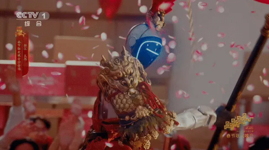 最后,以视听奇观与科技赋能作为介质,实现城市形象的创新表达与价值传递。义乌分会场的节目将最具辨识度的城市声响与震撼人心的科技场景深度融合,在感官的层层递进中,完成对城市气质与未来愿景的生动书写。如果说“鸡毛”是义乌创业史的视觉印记,那么“拨浪鼓”的“咚咚”声便是贯穿节目始终的灵魂之音。这声音从历史的深处摇响,在当代的义乌找到回响——“最牛老板娘”敲击计算器的“哒哒”声渐次加入,扫码枪的“滴滴”、玩具的发条声、爆单机器的嗡鸣、键盘的敲击……这些属于“世界超市”的日常声响,被精心编织成一曲生机盎然的声音交响乐。无需多余解说,观众便用耳朵“听见”了一座城市的忙碌、高效与蓬勃生机。声音未落,科技已起。无人机群应声升空,机械臂随之舞动递出金箍棒,引出1.8米高的全新“孙悟空”机器人踏云而出,踩上机器狗在琳琅满目的科技街区穿行。中国神话与智能制造的碰撞,在此刻化作奇绝的视觉奇观,重塑着人们对这座城市的认知。