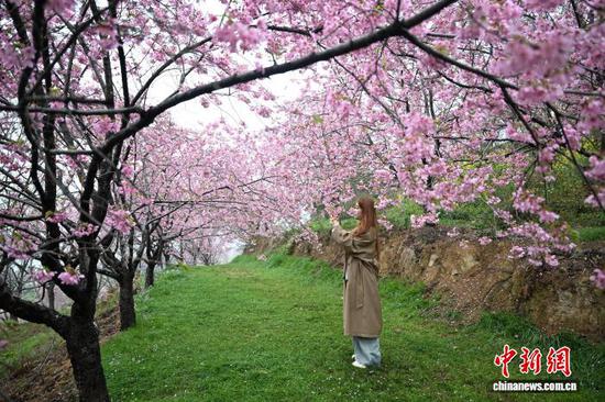 图为:游人在樱花林间赏花拍照。中新社记者 王刚 摄