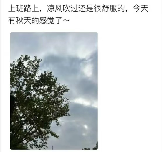 有网友说:“今天起来感觉凉爽多了”,还有的说:“上班路上,凉风吹过还是很舒服的,今天有秋天的感觉了”。