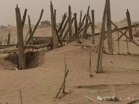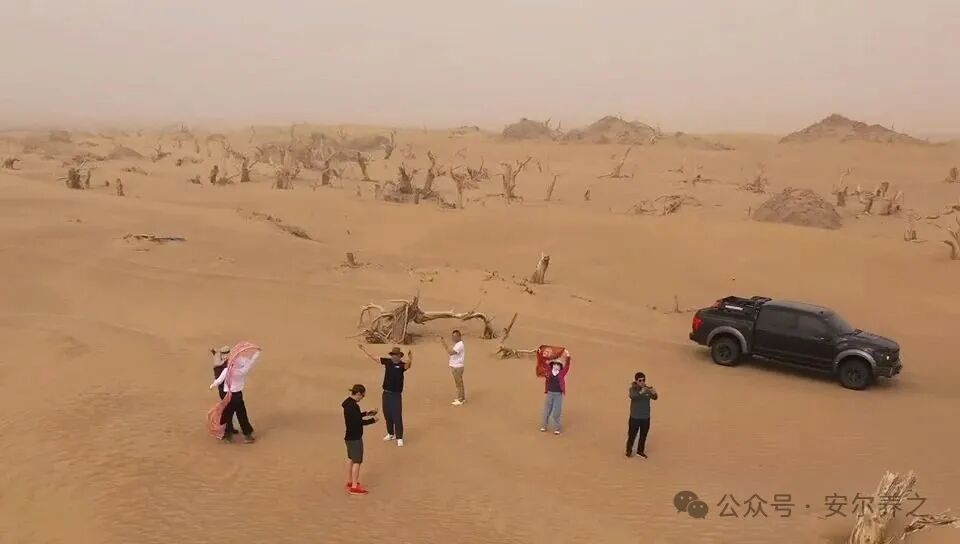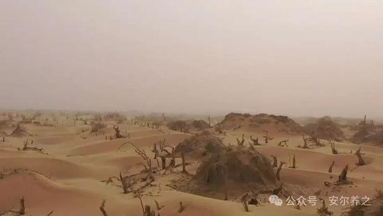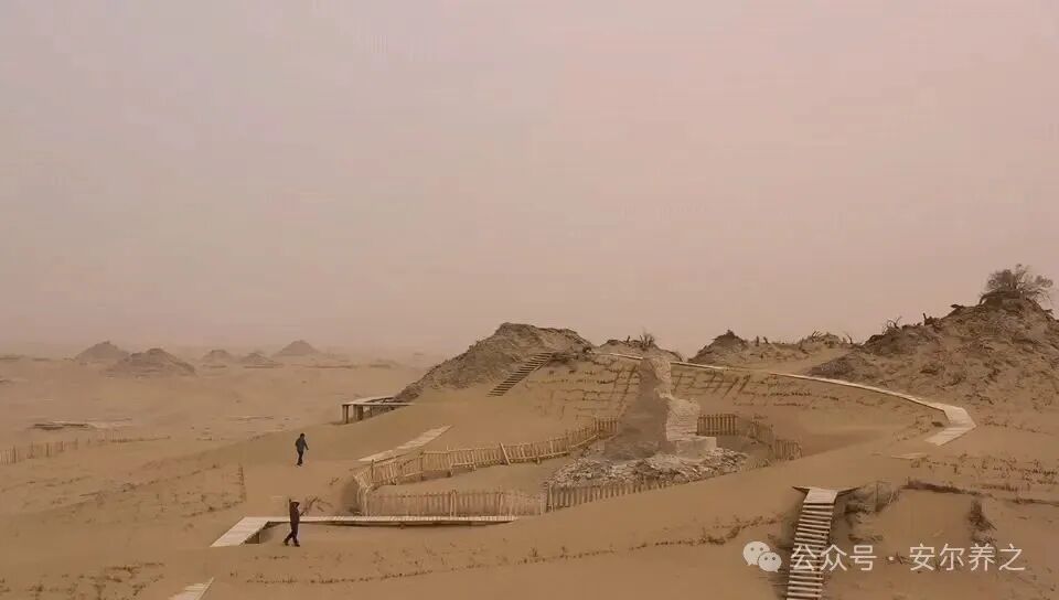 太阳渐高,炽热的阳光融化在漫天的风沙里。风势渐强,呼啸着席卷而来。我独立于高耸的沙丘之上,看无数的沙丘如凝固般的巨浪层层叠叠,把昔日繁华的市街、寺庙、佛塔、屋舍、果园、陶窑等深埋其下,不禁叹息这自然洪荒之力的强大,悲悯人类文明的脆弱。此际,风沙骤然猛烈袭来,我赶忙拿出夫人为我准备的口罩戴上,以抵御风沙的袭击。