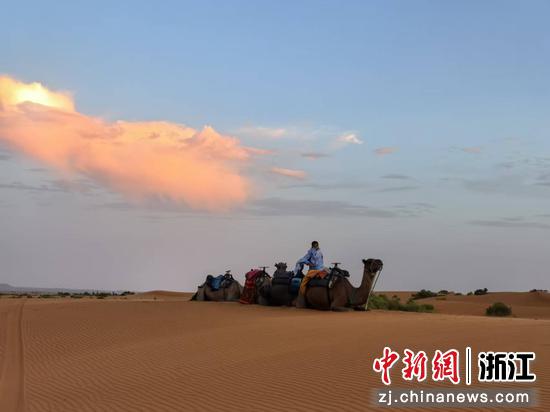 牵驼队的是位十三四岁的当地少年,白色头巾下露出明亮的眼睛。旧帆布鞋沾着沙粒,却丝毫不影响他的利落动作,指尖拂过驼峰时,还会轻轻拍拍骆驼脖颈,像是在安抚伙伴 。他说暑假总帮父亲照看驼队,手中缰绳轻拉,骆驼便默契调整步伐。少年牵着缰绳默默走着,声音被风吹得细碎,恰好融进撒哈拉的暮色里 。