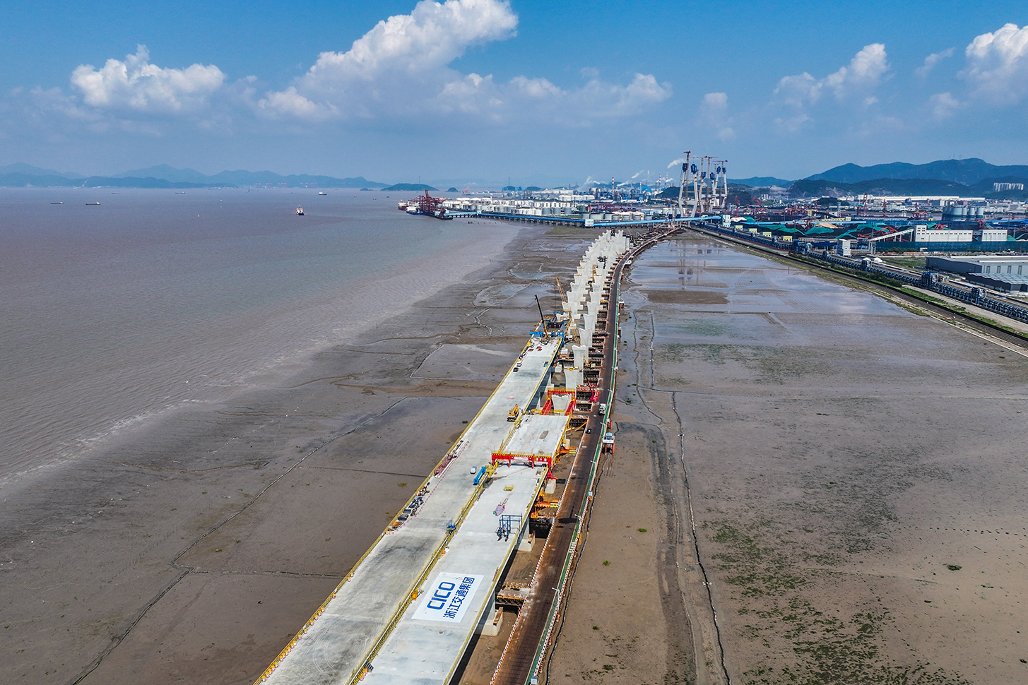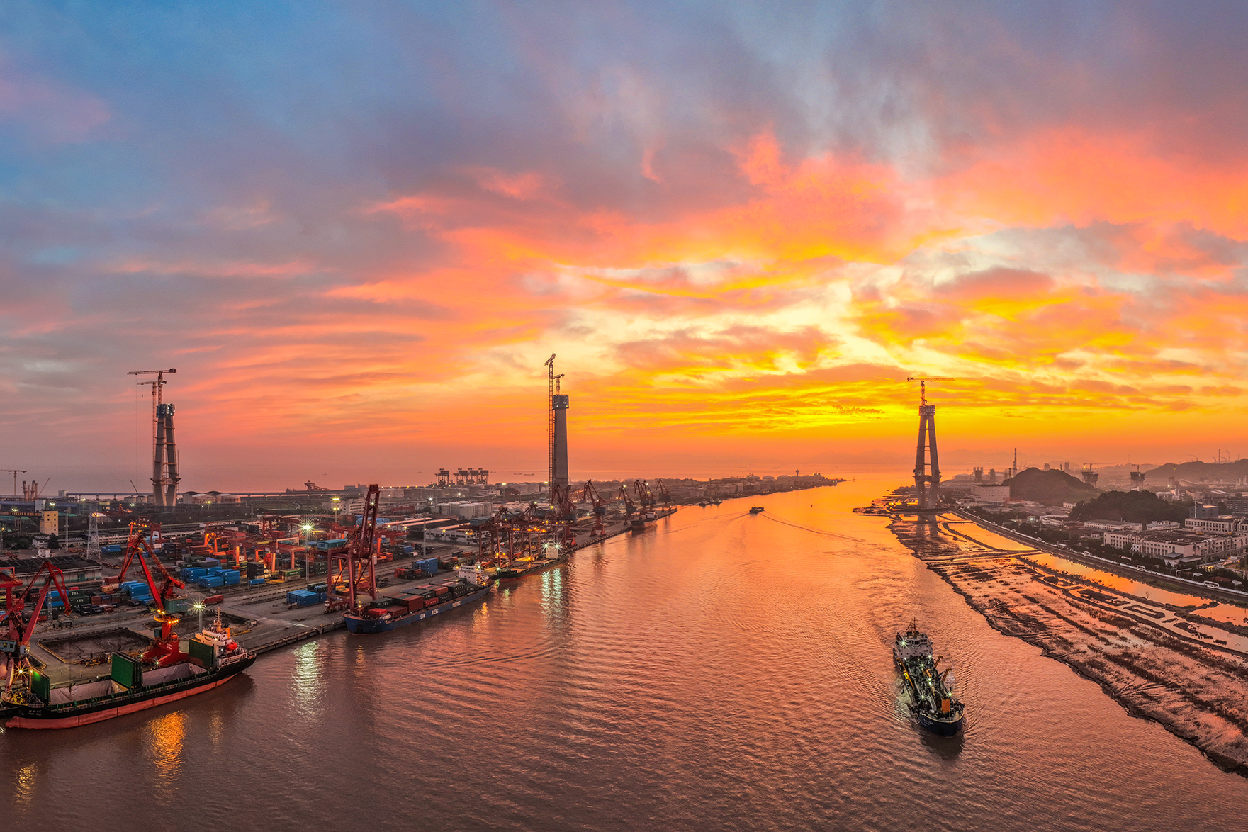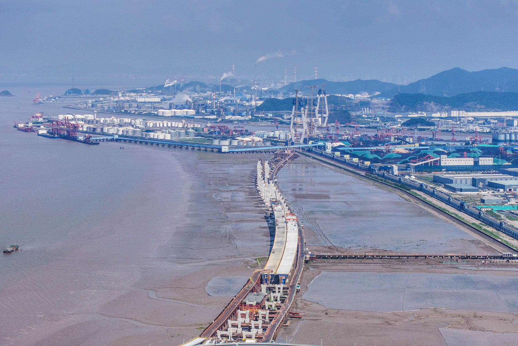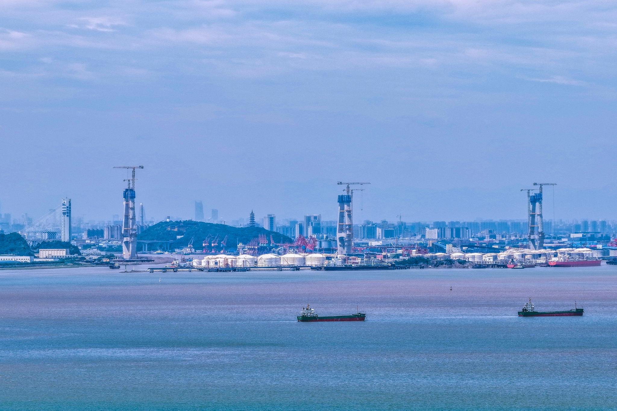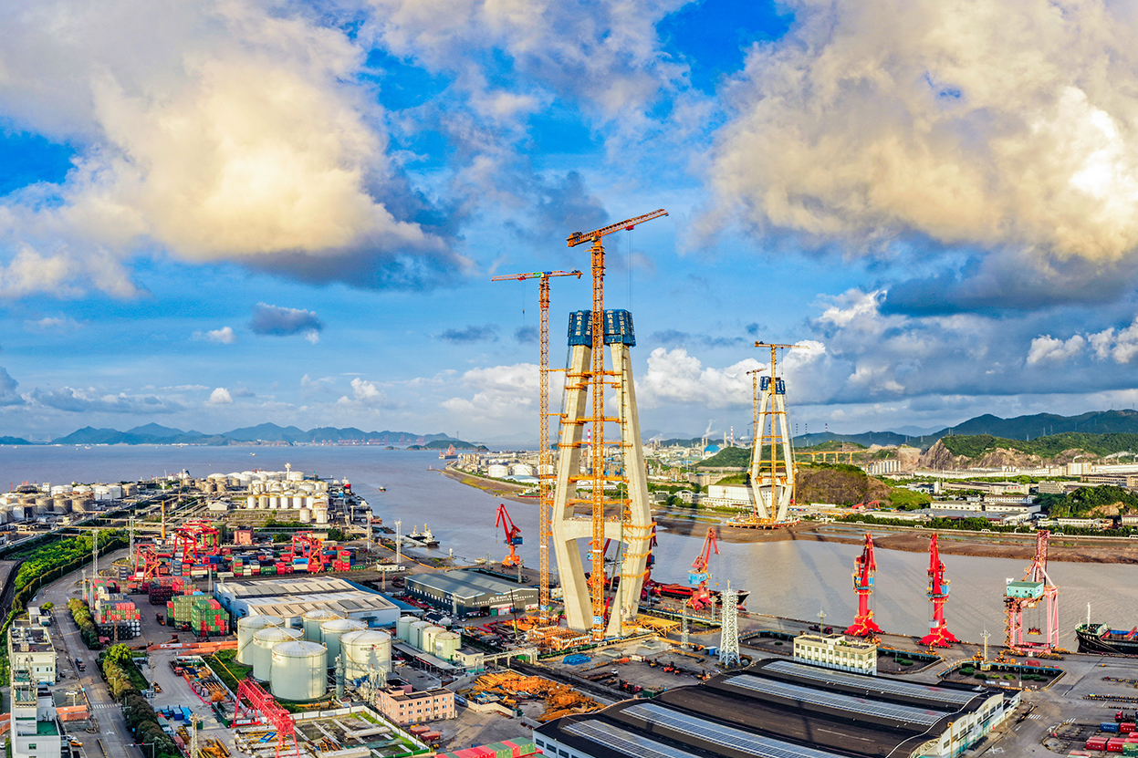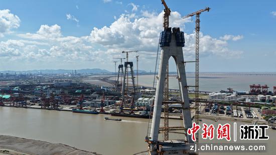 仲夏八月,浙江宁波北仑港区车流如织。在距江面近两百米的高空,杭甬复线宁波三期项目甬江特大桥施工现场塔吊林立。三座主塔如钢铁巨人般矗立甬江入海口,最高建设高度已突破185米,600余名建设者正冒着高温进行主塔封顶施工,项目建设跑出“加速度”。