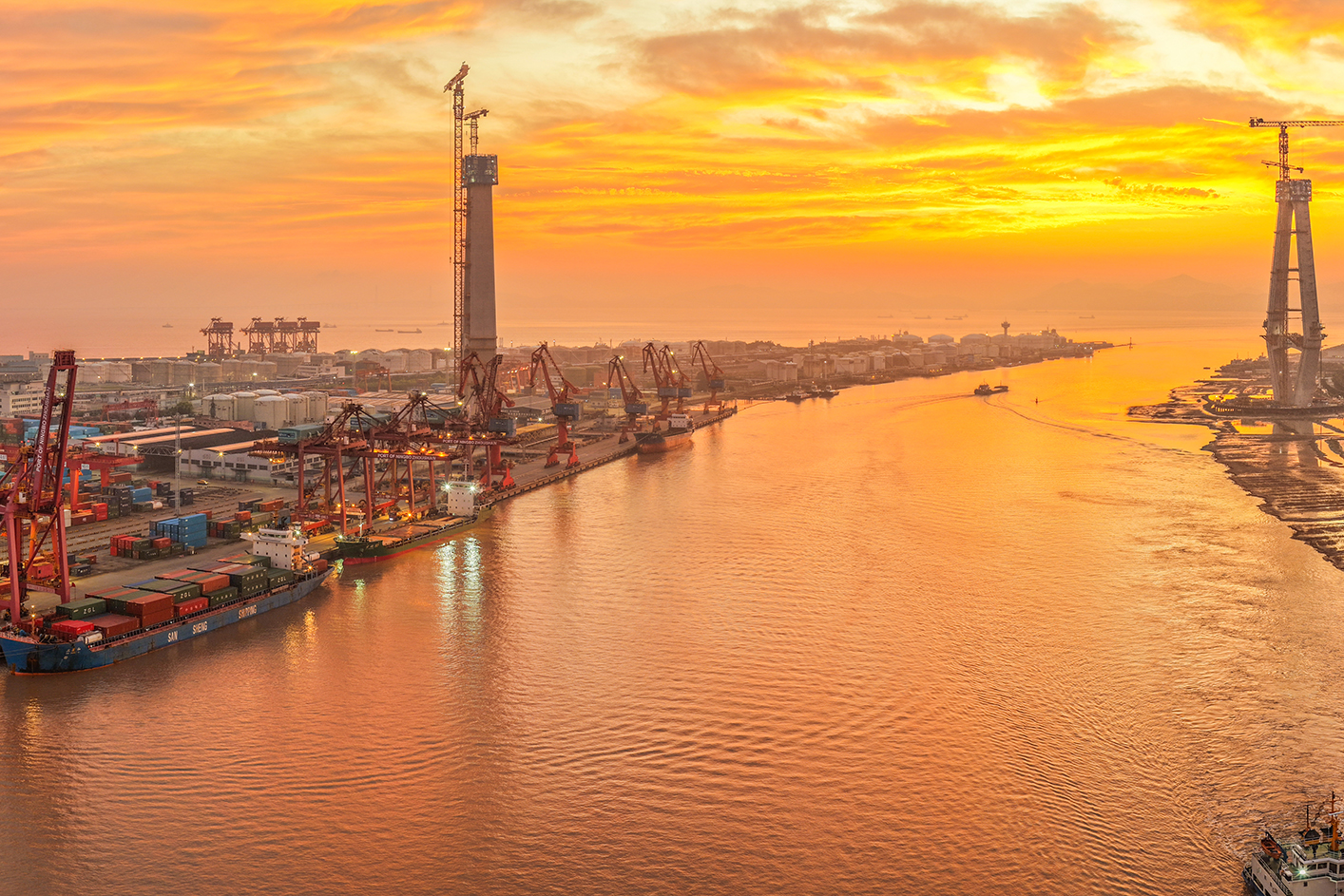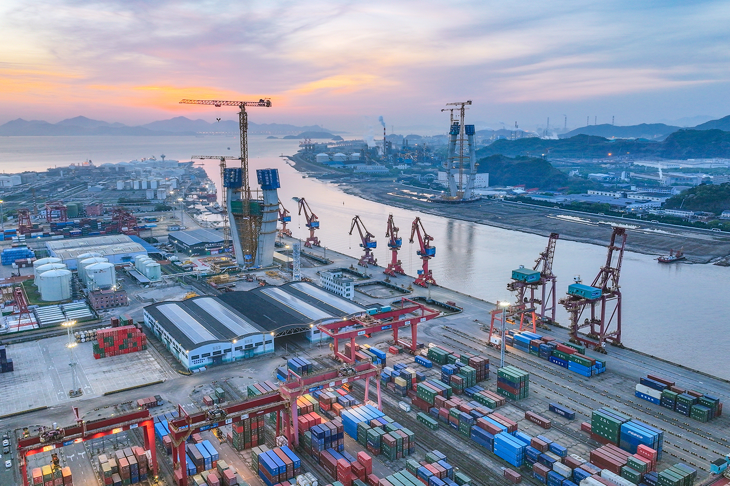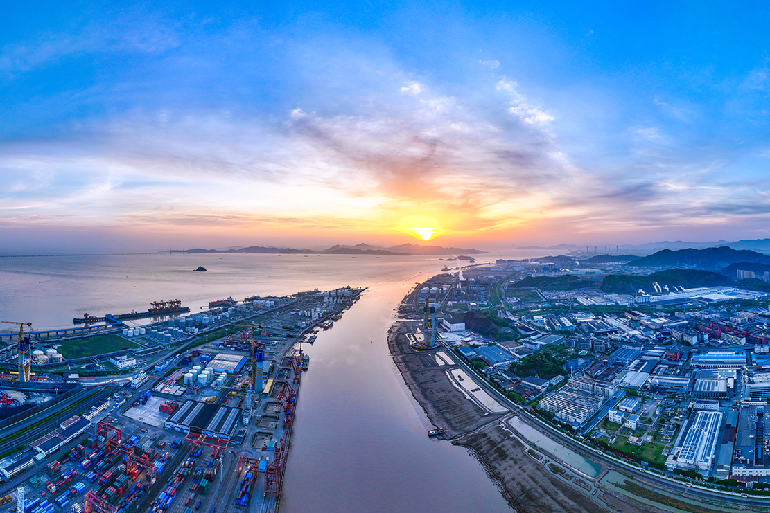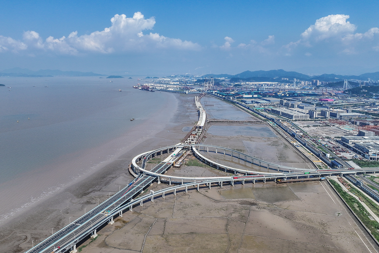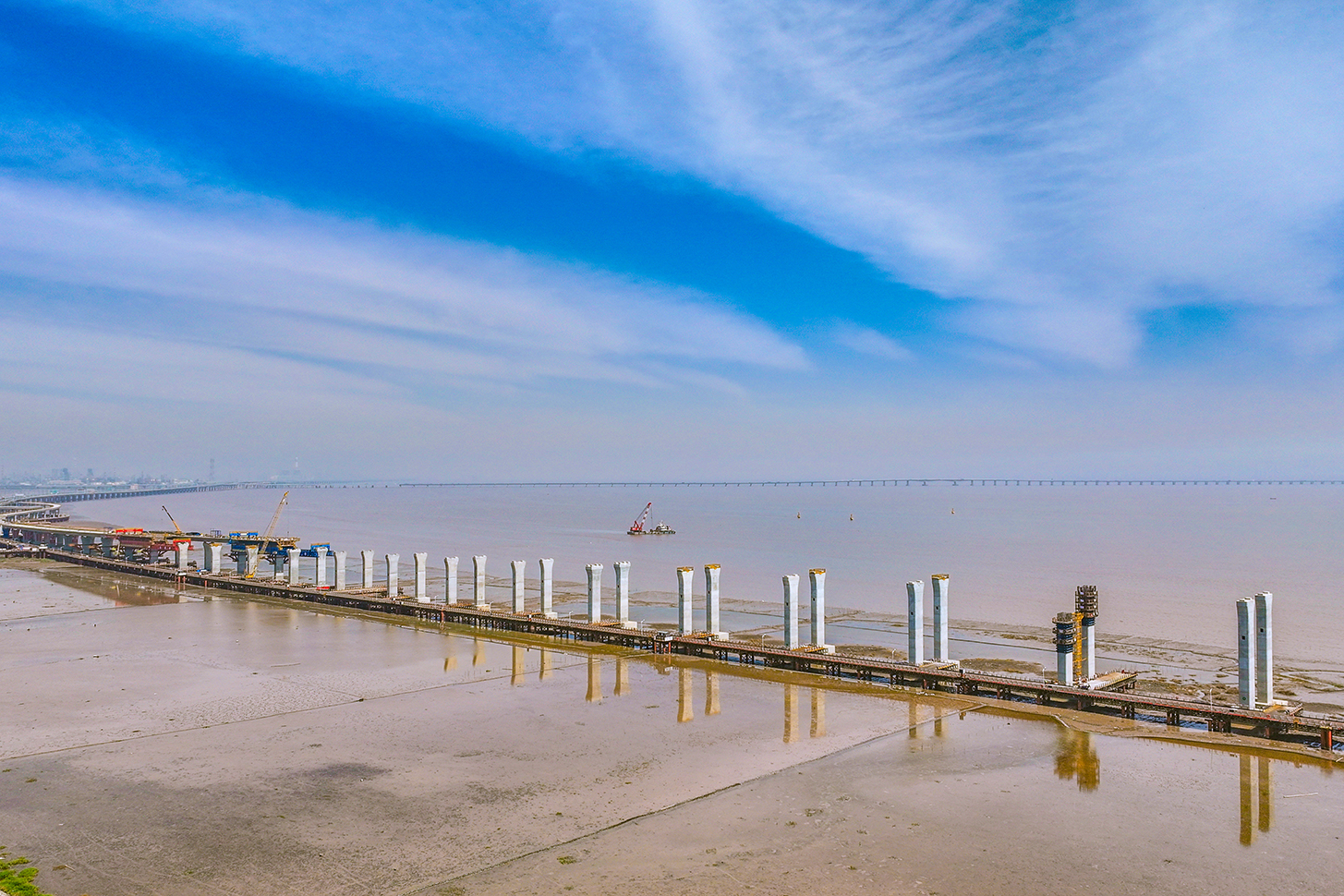 仲夏八月,浙江宁波北仑港区车流如织。在距江面近两百米的高空,杭甬复线宁波三期项目甬江特大桥施工现场塔吊林立。三座主塔如钢铁巨人般矗立甬江入海口,最高建设高度已突破185米,600余名建设者正冒着高温进行主塔封顶施工,项目建设跑出“加速度”。