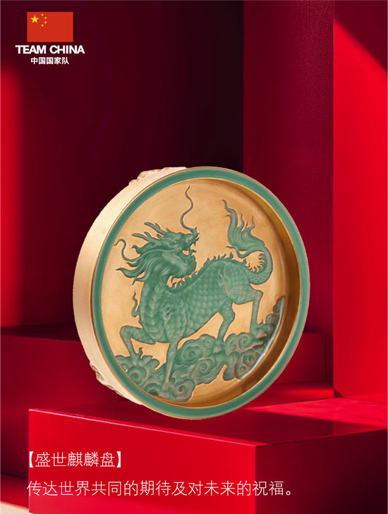除了《盛世麒麟盘》外,其余几款青瓷文创产品同样巧妙运用了中国传统技艺的精髓,与体育精神、奥运精神以及中国国家队的独特标识等元素相互融合,展现出独特的艺术魅力与深厚的文化内涵。
