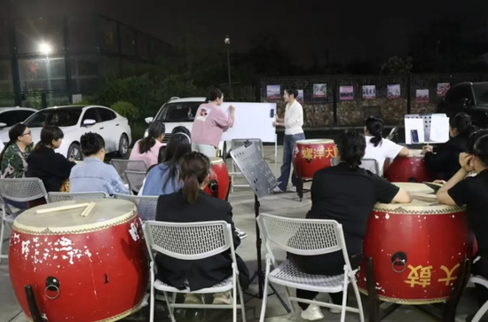 今年4月,在谢沁妍的积极协调下,专业的民族打击乐老师王熠昕走进了水滨村,为村民们开设了大鼓课程。文化礼堂管理员张茂金对此干劲满满,她身兼学员和文艺轻骑兵带头人的双重身份,不仅组织大家练习,并和王熠昕老师将气势磅礴的大鼓表演带上了端午龙舟活动的开场,让传统节日焕发出新的魅力。