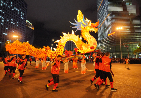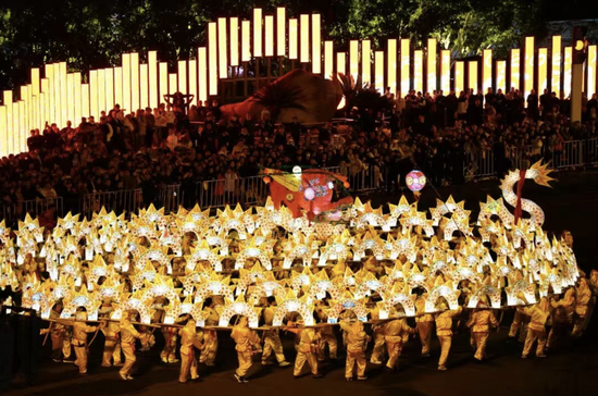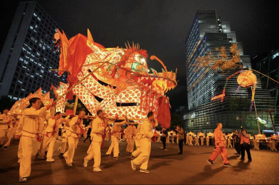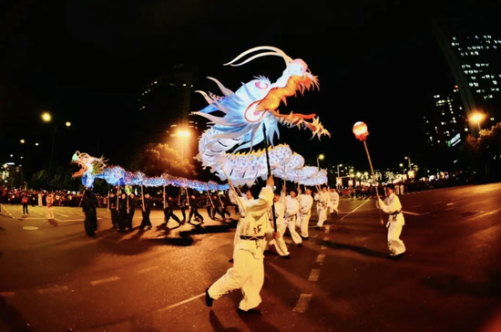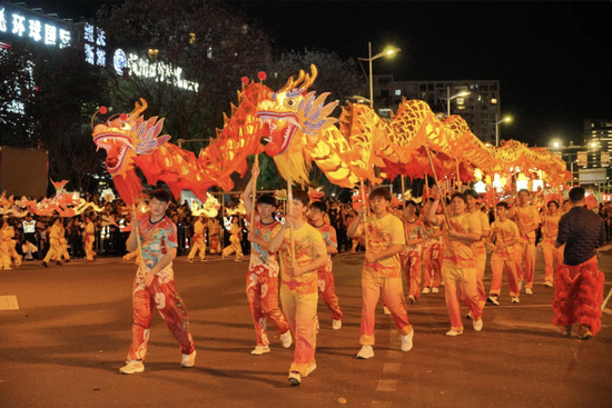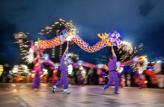 光影中,龙灯腾跃向前、熠熠生辉,勾勒出这座城市实干奋进、蓬勃向上的奋斗图景。