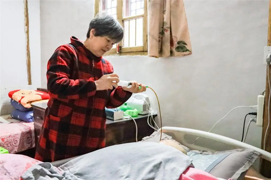彩霞已记不清多久没睡过囫囵觉了:“老李经常半夜咳痰把我吵醒,但是有时听到他晚上没动静,我反而会担心,就开夜光灯看看他。”她说,自己一晚上最少帮丈夫翻3次身,还要吸痰、换尿袋,有时给他敲背都困得睁不开眼。