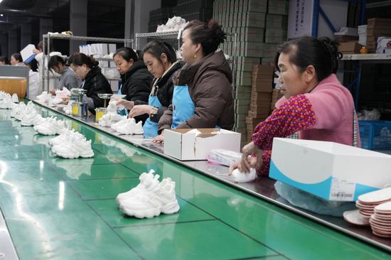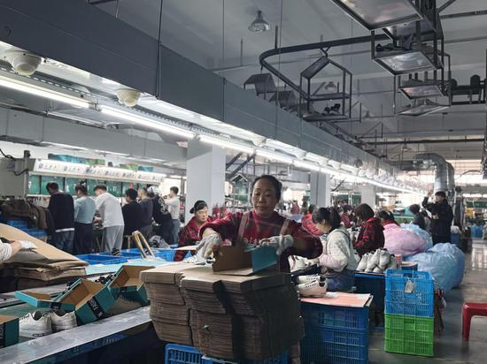 当天,瑞安市骄阳鸣人鞋业有限公司(以下简称“骄阳鸣人鞋业”)的生产车间内,同样是一派热火朝天的繁忙景象。现场,来自四川成都的员工王华,正熟练地折叠鞋盒,平均每4秒就能完成一个鞋盒的成型作业。王华说,她从事制鞋配套工种已有20余年,在骄阳鸣人鞋业也工作了5个年头,见证着企业一步步发展壮大。凭借着一手娴熟的老手艺,她成为车间里的“效率能手”,为企业复工复产提速增效。