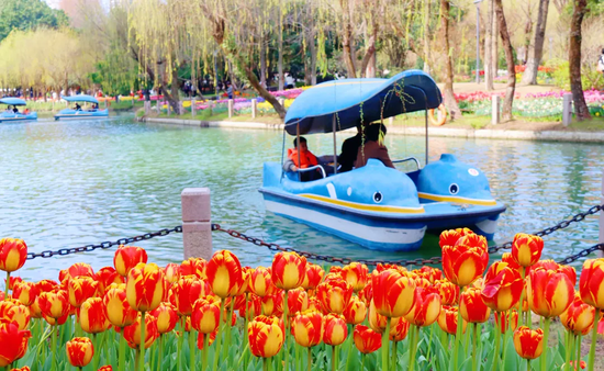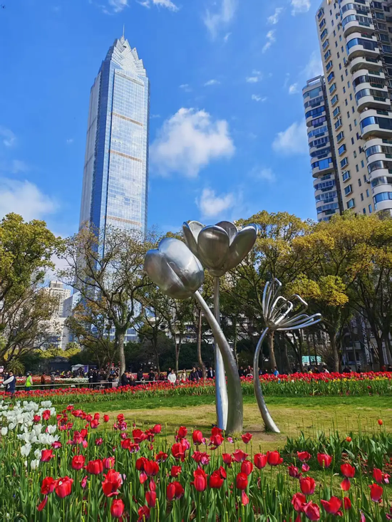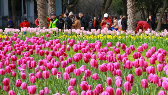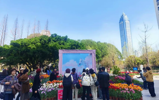 如何将赏花的瞬时流量转化为持久的消费增量,让游客慢下来、留下来,惠及更广的商业区域,成为此次花展的深层探索。“花是吸引人来的理由,但要让人留下来、愿意花钱,还得靠有内容的配套。”鹿城区园林绿化管理中心党组副书记、主任陈飞雷一语中的。为此,园内核心赏花区轮番上演郁金香市集与百姓舞台;园外,大南商圈则主动承接外溢效应,多处设置郁金香打卡装置,吸引行人驻足拍照,顺道消费,实现了“园内赏花、园外消费”的良性互动。