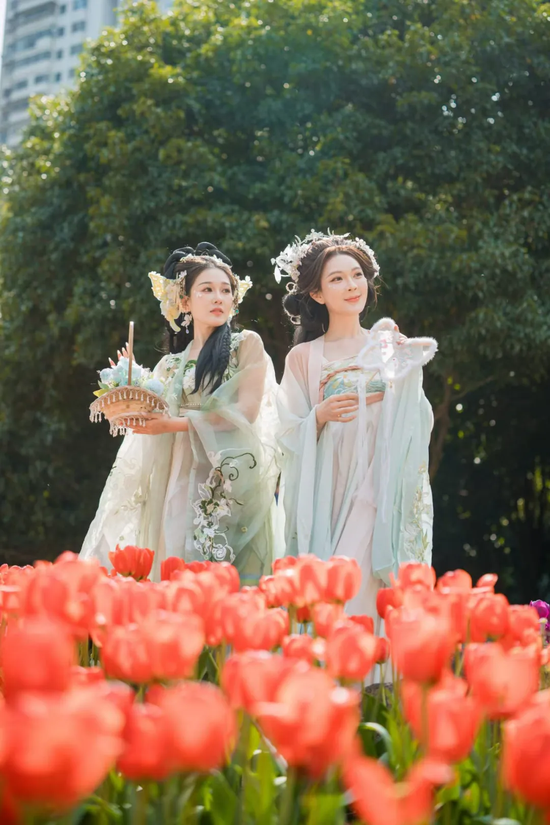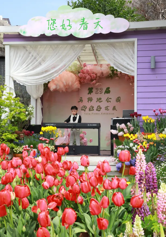 真正让游客驻足流连的,不只是眼前的花海,更是花间流淌的人文景致。为打破传统“走马观花”的赏游模式,本届花展深耕文化内涵,推出郁金香市集、百姓舞台等系列主题活动,更有“十二花神”巡游活动,伴随着悠扬的钢琴声与动情的歌唱表演,为游客奉上一场视觉与听觉交织的国风盛宴。观花径上、廊亭之中,随处可见手持手机、争相打卡拍照的游人,仿佛置身于一场可游、可玩、可消费的春日雅集。